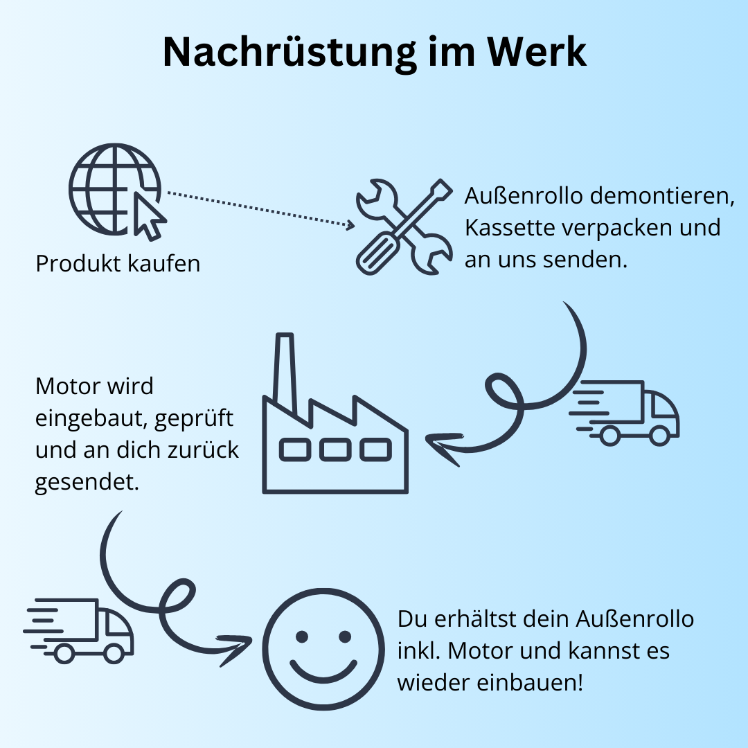 Este producto es sólo para cuando usted quiere enviar en su persiana enrollable exterior existente contra el calor y nosotros retrofit el motor en nuestra fábrica. Incluidos los gastos de envío a la fábrica y los gastos de devolución.
