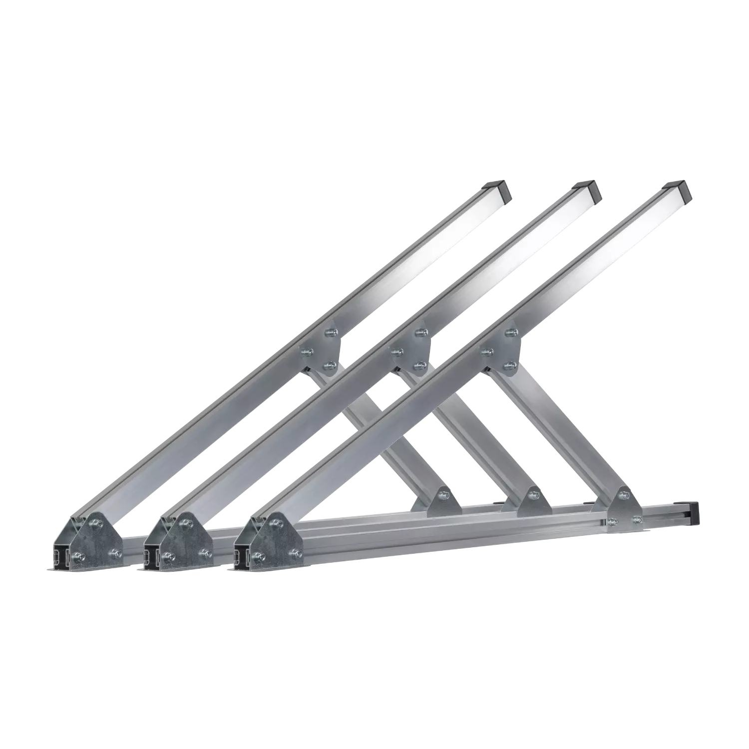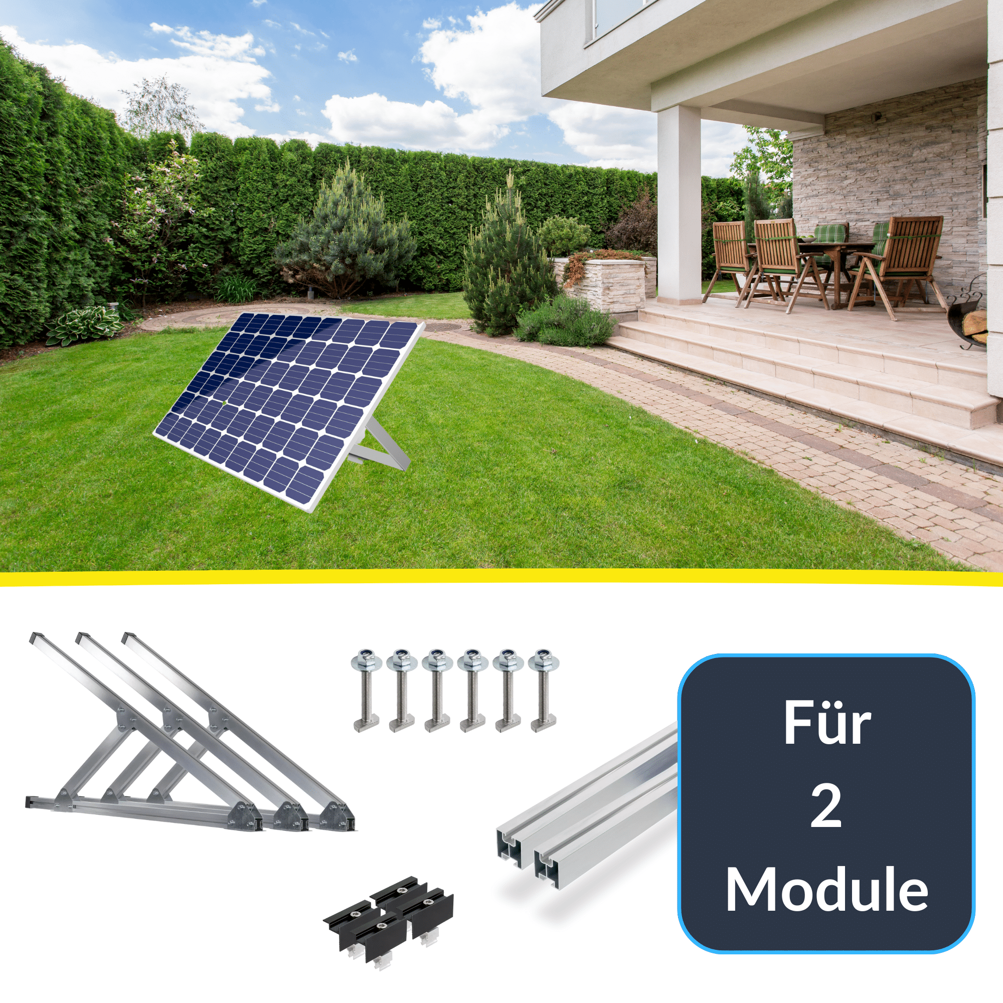 Nuestro set de montaje para centrales eléctricas de balcón para tejados planos/jardines le ofrece la solución ideal para instalar o fijar de forma segura y cómoda módulos solares en el jardín o en un tejado plano.